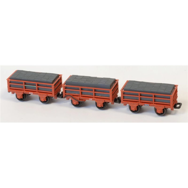 Each wagon carries its own specific markings and running number. The sets are made up with a random selection of running numbers. Each wagon is fitted with a removable slate load, which is conveniently hollow, thus giving the modeller the added option of including some further weight if required.