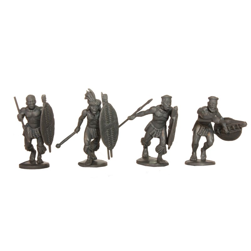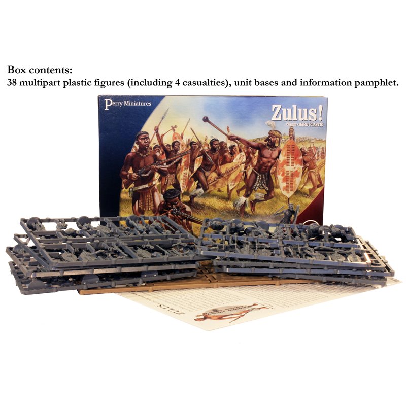 38 (including 4 casualties) multipart plastic figures, with unit bases and information pamphlet. There are enough firearms to equip 10 warriors or all can be armed with spear, javelin or knobkerry.