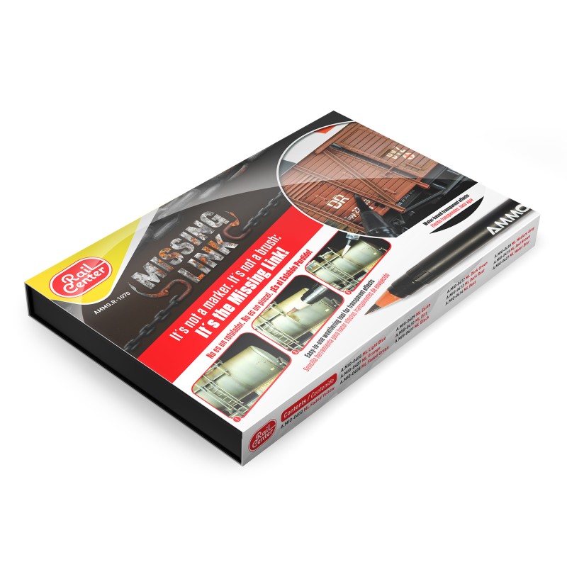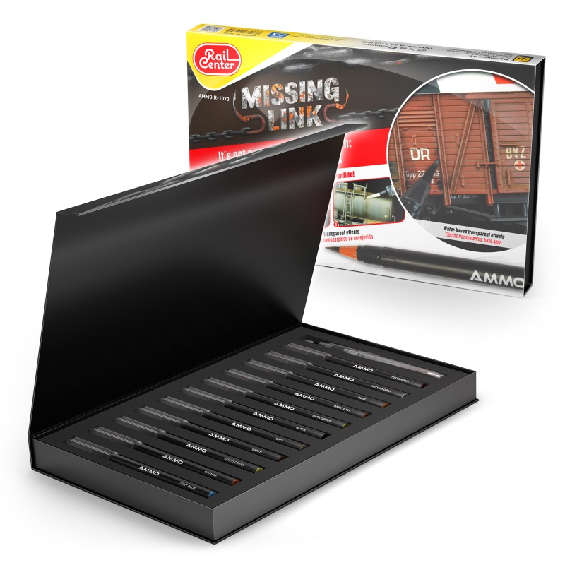 The new brush tip watercolor marker set from AMMO by MIG Jimenez represents an evolution in modeling tools. Designed for precision, versatility, and ease of use. This set of 12 transparent colors has been carefully selected to reproduce realistic weathering and wear effects on locomotives and rolling stock from all eras, with professional results. With Missing Link Brush Tip markers, you can apply everything from filters to weathering effects on your models.