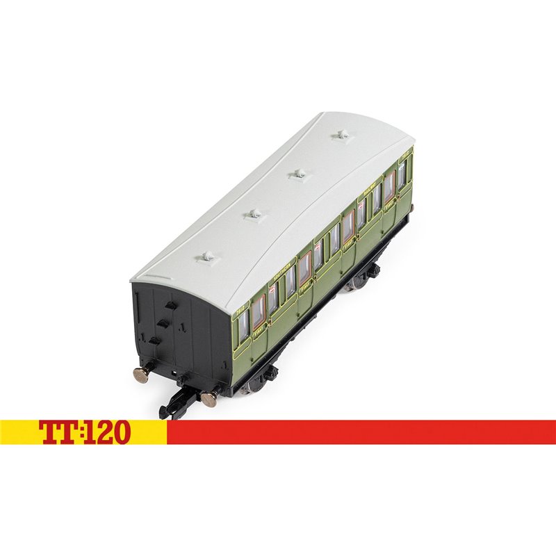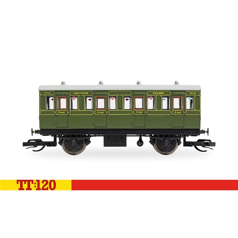 Hornby’s TT:120 SR First Class Four-Wheel Coach is a finely detailed model capturing the charm of early 20th-century rail travel, featuring a distinctive four-compartment design in authentic SR green livery with crisp First Class markings.