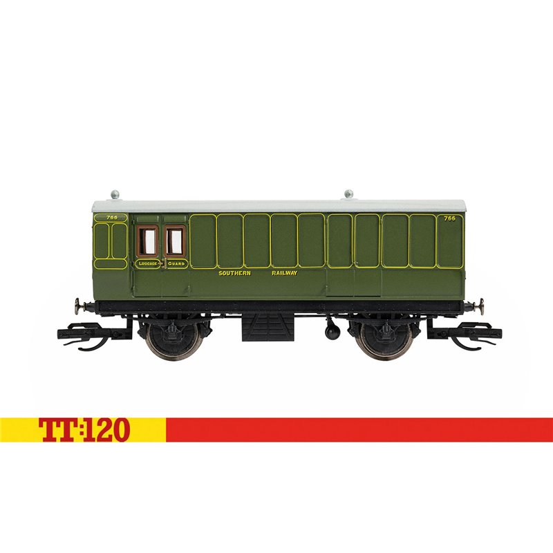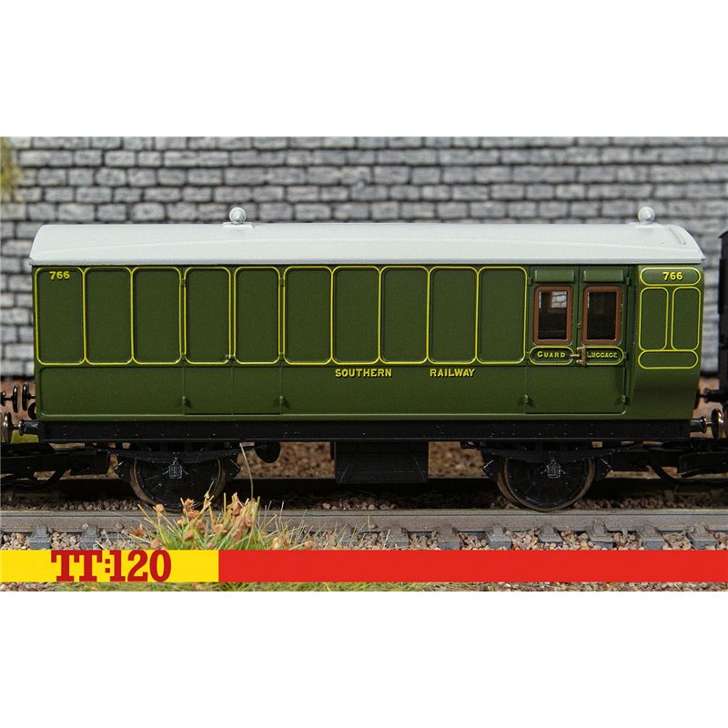 Hornby’s TT:120 SR Third Class Four-Wheel Passenger Brake Coach is finished in authentic SR green and combines Third Class seating with ample luggage space. It also had a dedicated guard’s compartment. Known as a Passenger Brake or Luggage Van, allowing the original coach to play a crucial role in transporting both passengers and their belongings across the network.