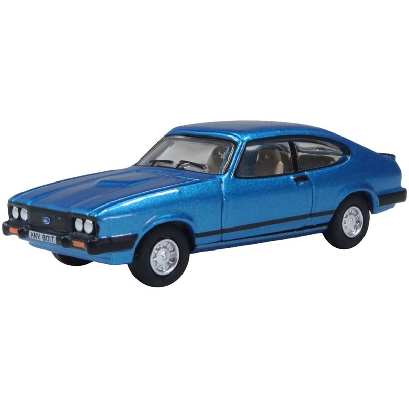 Painted in a brilliant bright blue with pale ivory interior seating and black dashboard/steering wheel, the exterior body trim is essentially black including bumpers, door handles, grille and the wheels feature a silver finish. The rear of the vehicle features the Capri 1.6 GL marque while the blue Ford badge is printed in blue in the centre of the radiator grille.